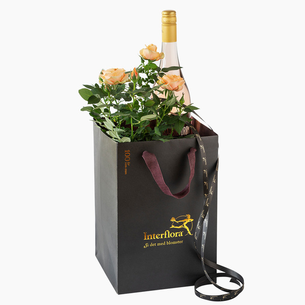 Vår eksklusive gavepose fylt med en vakker potterose og vår populære Rabarbradrøm cider.